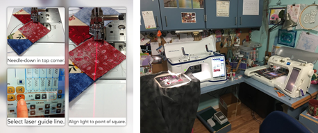For regular sewing it has many utility stitches, decorative stitches and stitch adjustments.  I appreciate the ability to fine-tune the needle placement for a scant quarter inch seam.  The machine stitches very smoothly and I very rarely have to make any tension adjustments.  When I’m piecing half square triangles or other stitching that requires accurate placement of stitching lines, there is a laser beam that shines onto the fabric.  By using the laser light, I do not need to draw the pencil lines on the centers of the squares.